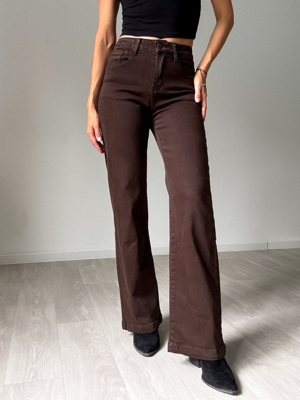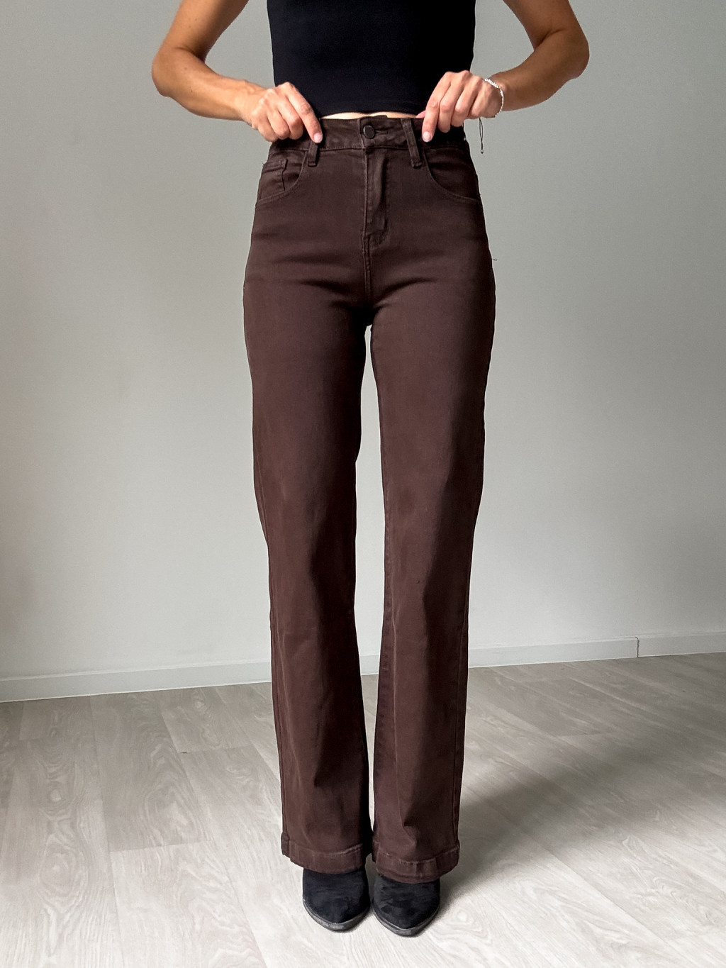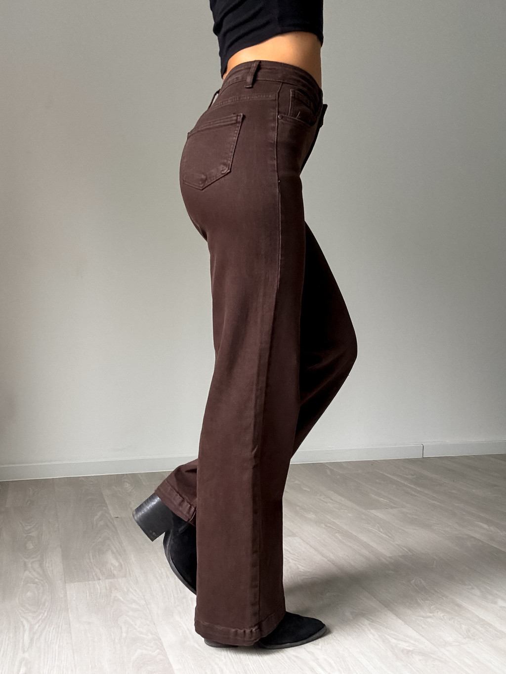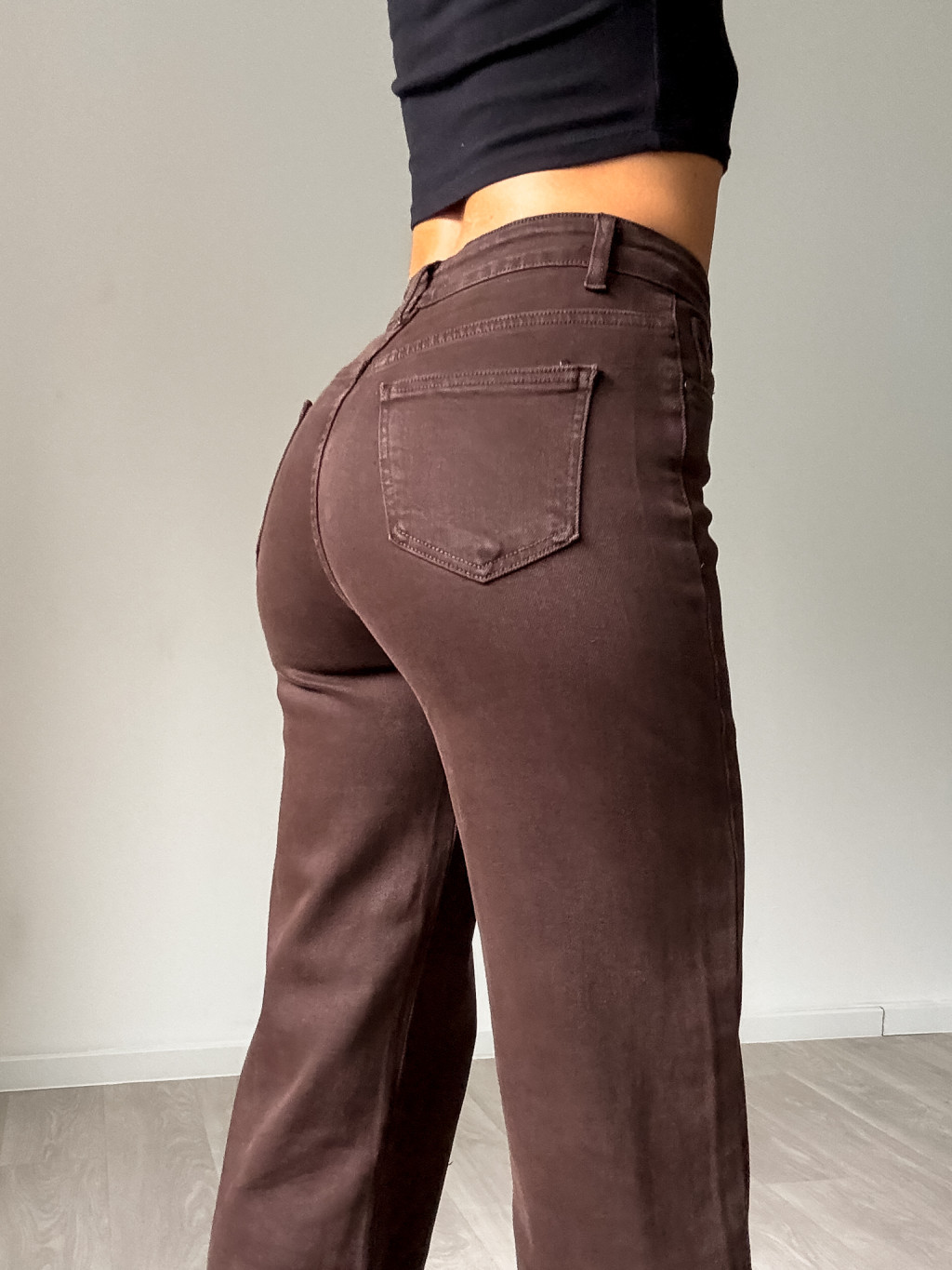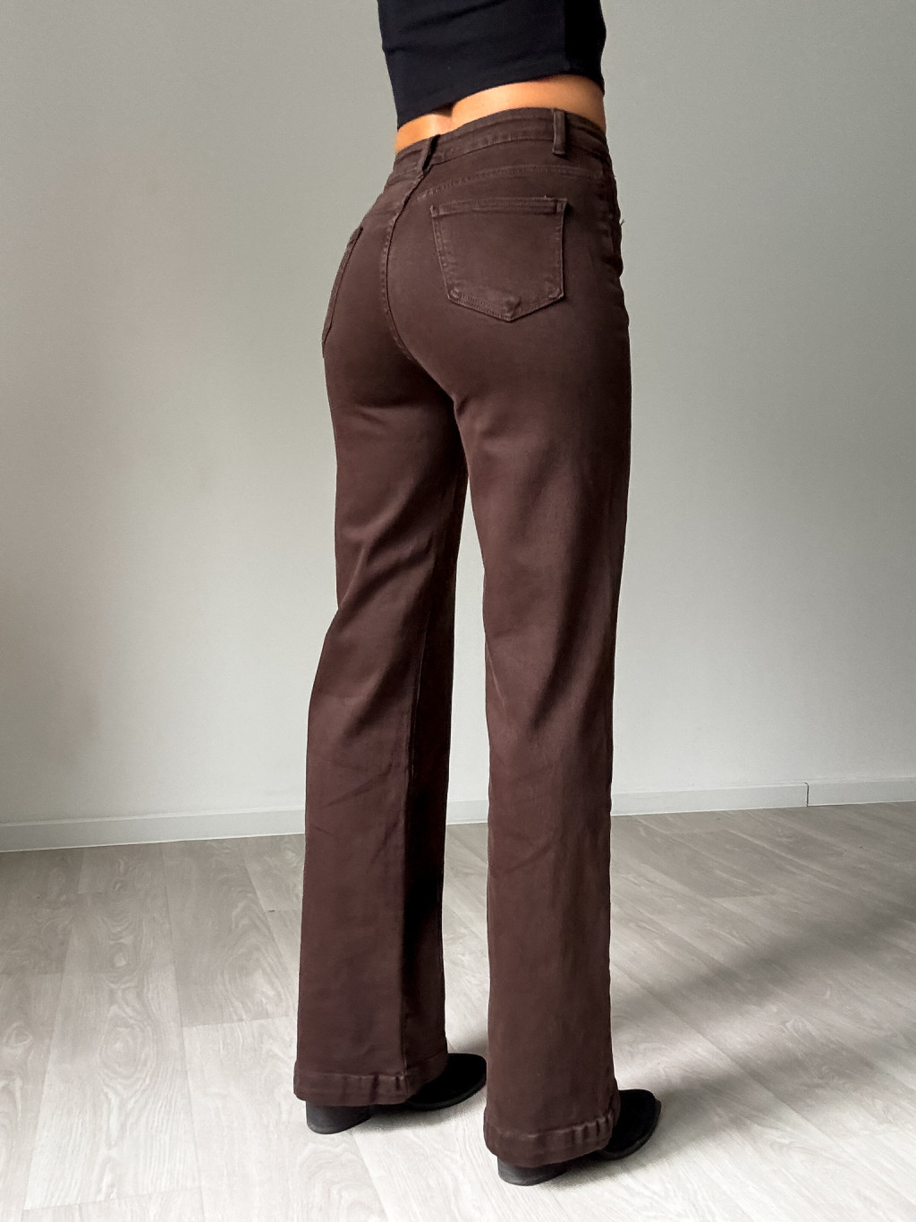 Dámské stylové džíny čokoládové barvy, vyšší pas, velmi pružné a pohodlné. Velikosti odpovídají.