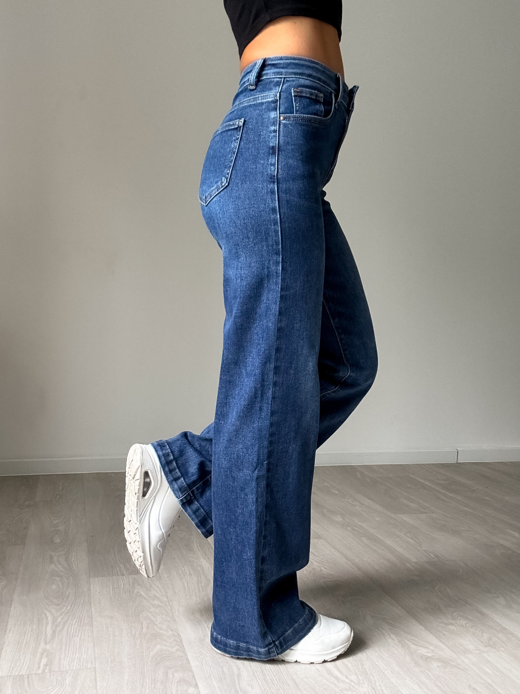 Dámské stylové džíny tmavě modré barvy, středně vysoký pas, jemně pružné. Velikosti odpovídají. Vel. XS - pas 2x 31 - 35cm. Vel. S - pas 2x 33 - 37 cm. Vel. M - pas 2x 35 - 39 cm. Vel. L - pas 2x 37 - 41 cm. Vel. XL - pas 2x 39 - 43 cm. Délka 107 cm (měřeno u vel. S, každá další velikost...