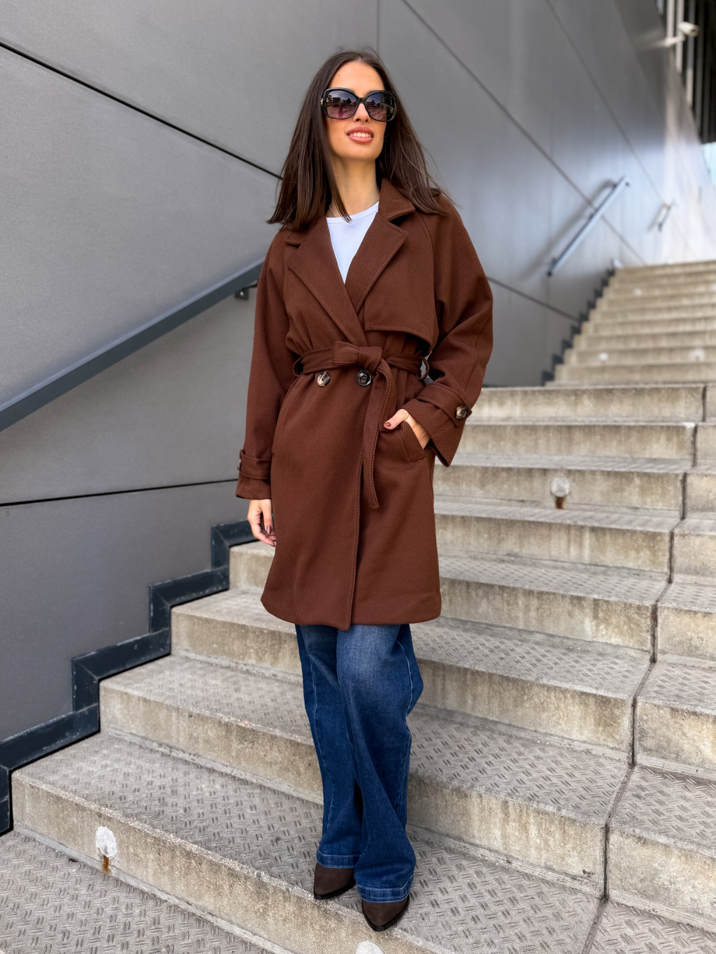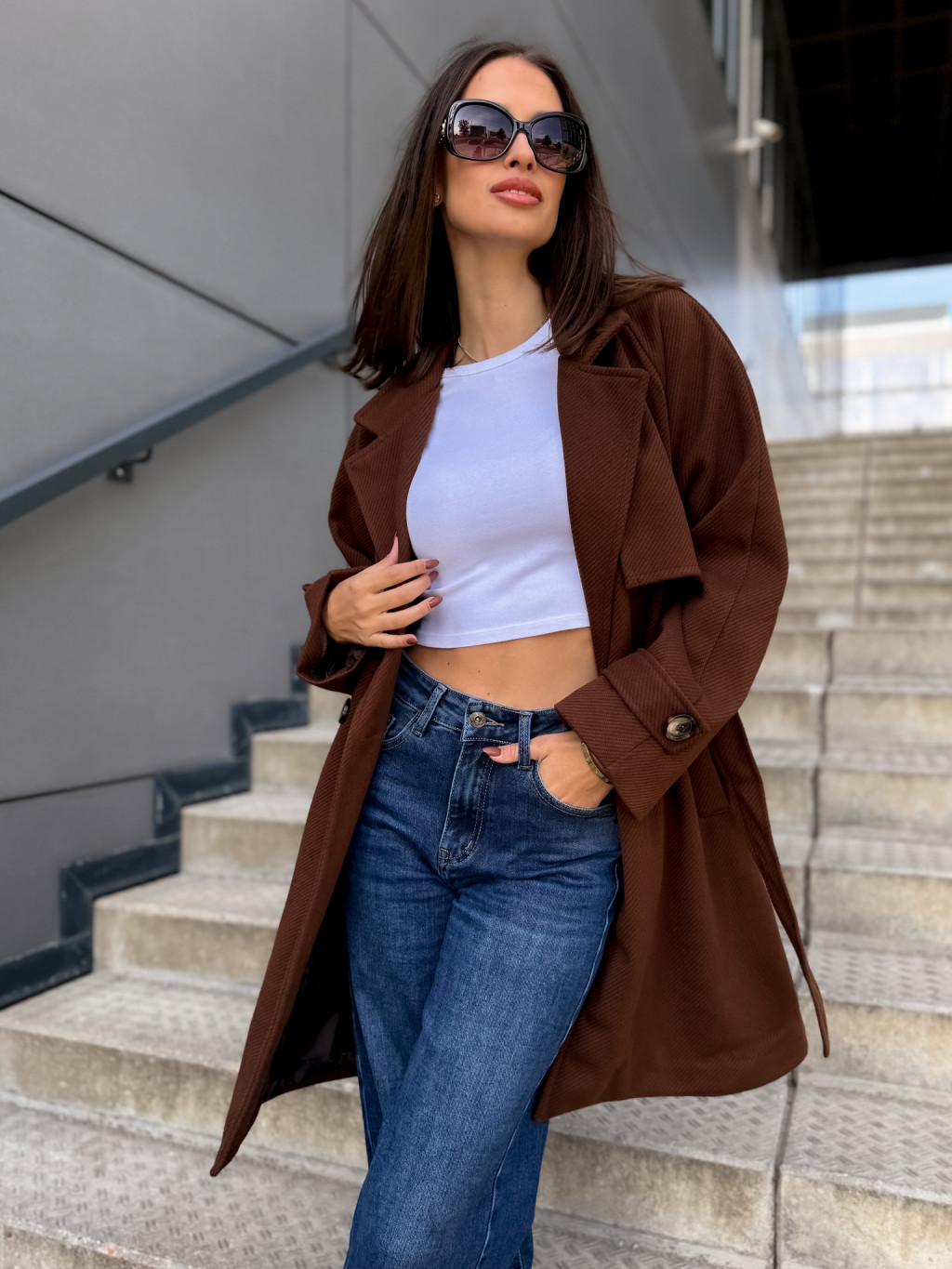 Elegantní dámský kabát, jemný proužek, zapínání na knoflíčky, s podšívkou, na bocích kapsy, na ramenou jemné vycpávky. Vel. unisize - sedí na S/M/L.