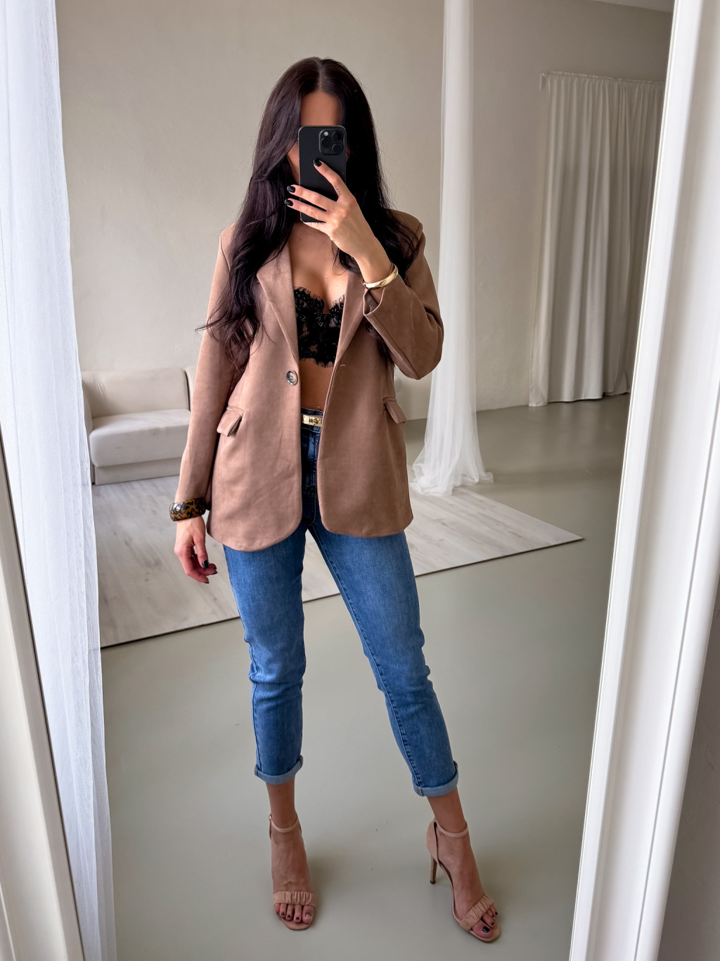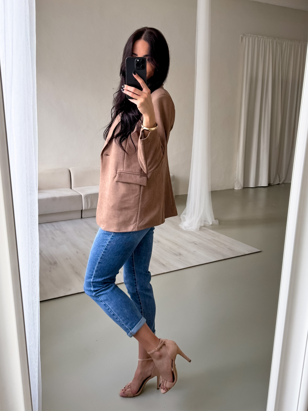 Dámské elegantní sako prodloužené délky, příjemný velurový materiál, podšité, zapínání na knoflíček, vel. unisize - S/M/menší L. Prsa 2x 53 cm. Délka 72 cm. Výška modelky 176 cm. Materiál: 95% polyester, 5% elasten.