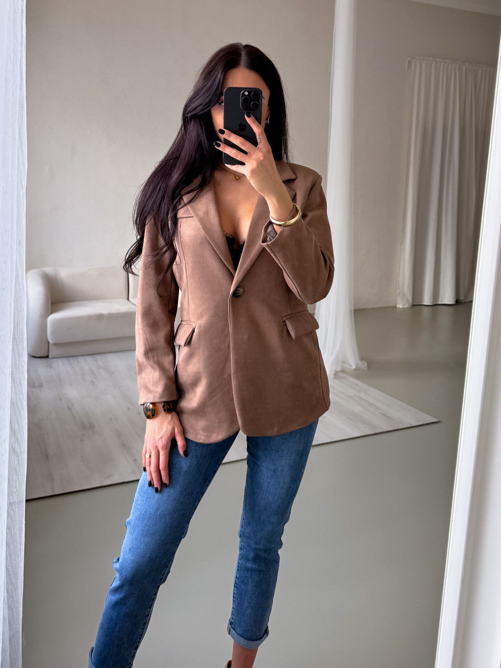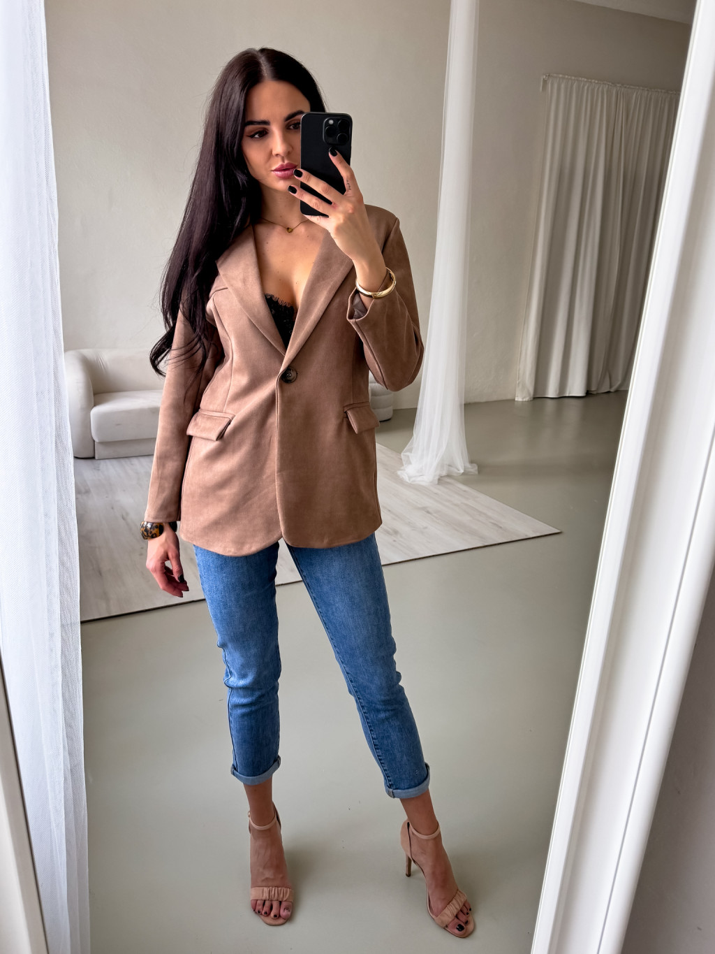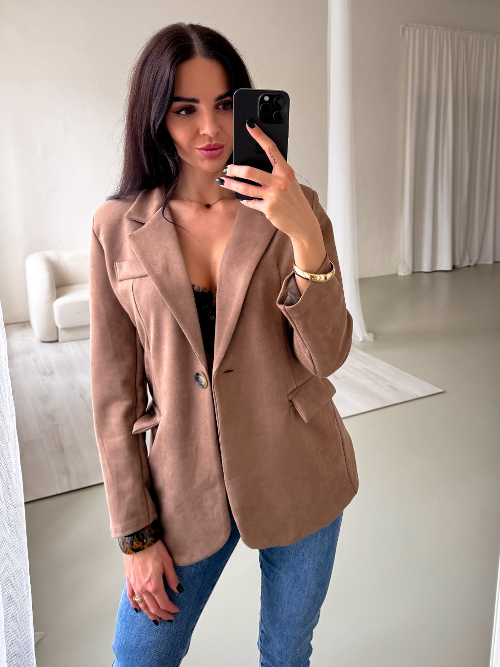 Dámské elegantní sako prodloužené délky, příjemný velurový materiál, podšité, zapínání na knoflíček, vel. unisize - S/M/menší L.