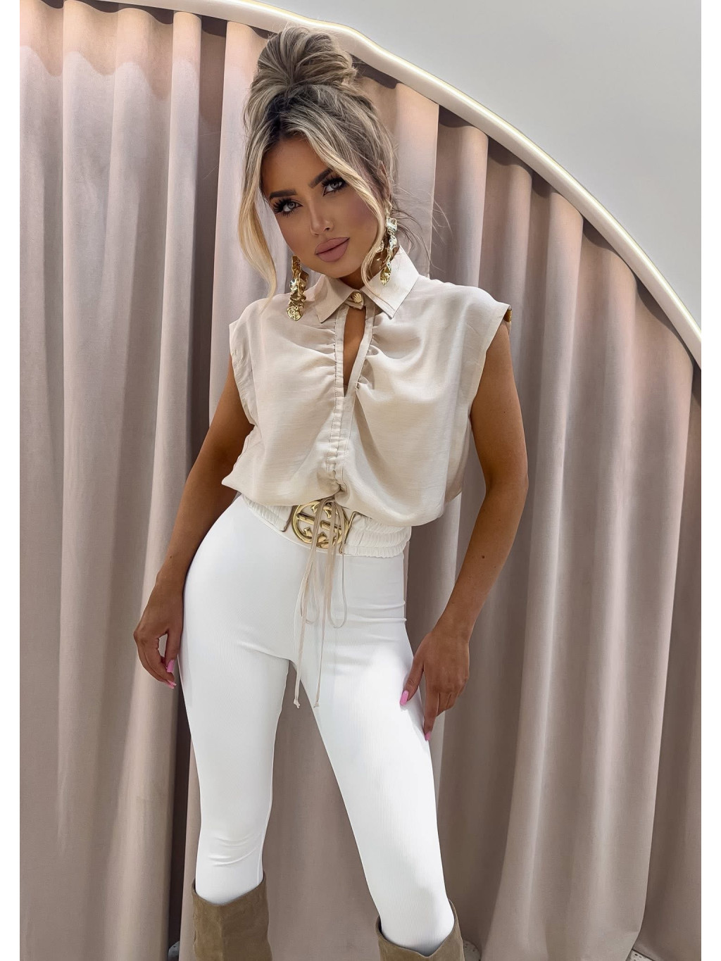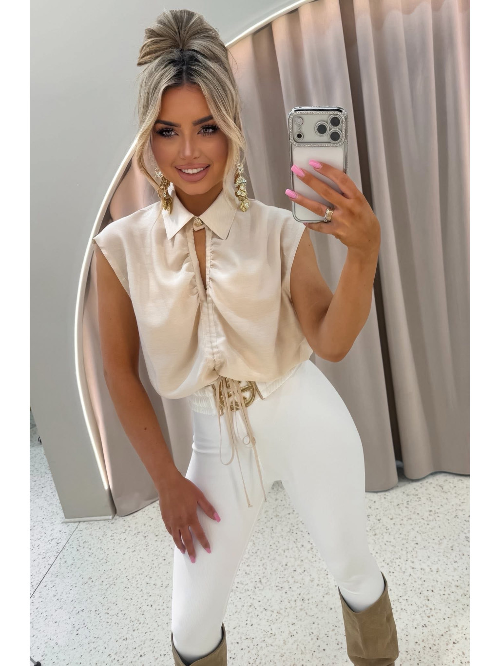 Elegantní dámská košile s krátkým rukávem, v pase gumička, vepředu šňůrka na stažení, u krku ozdobný zlatý knoflíček, lehký a vzdušný materiál, nepružná, vhodná kombinovat s kalhotami/sukní s vysokým pasem. Vel. unisize - sedí na S a M.