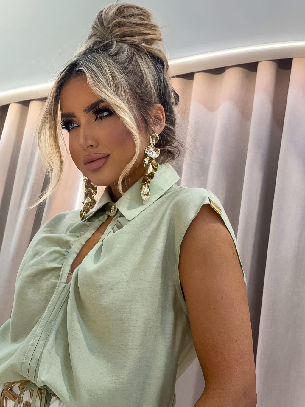 Elegantní dámská košile s krátkým rukávem, v pase gumička, vepředu šňůrka na stažení, u krku ozdobný zlatý knoflíček, lehký a vzdušný materiál, nepružná, vhodná kombinovat s kalhotami/sukní s vysokým pasem. Vel. unisize - sedí na S a M.