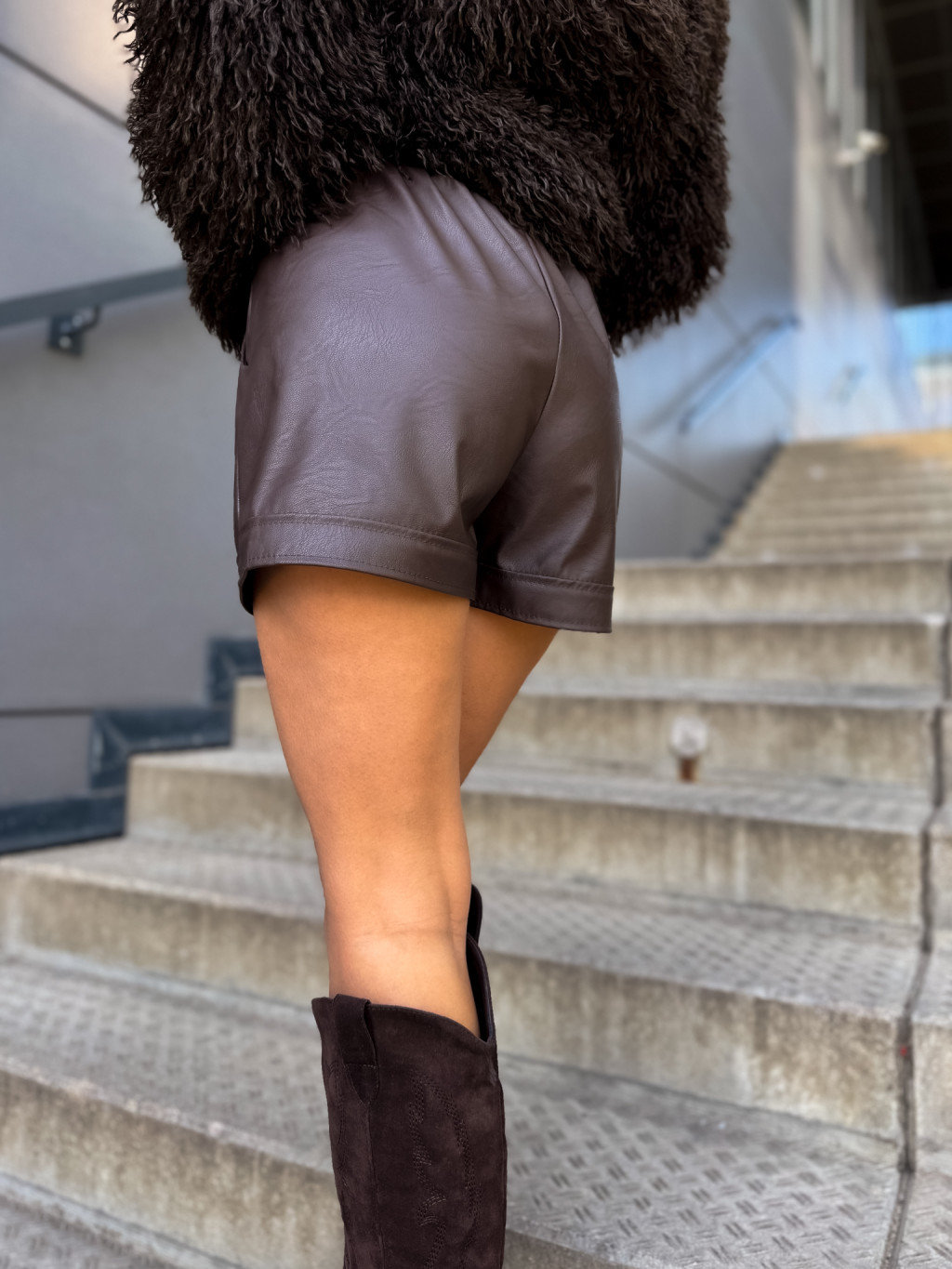 Dámské kraťasy z umělé koženky, v pase na gumu, na bocích kapsy, zezadu hladké bez kapes, volnější střih. Dostupné ve 3 velikostech.
