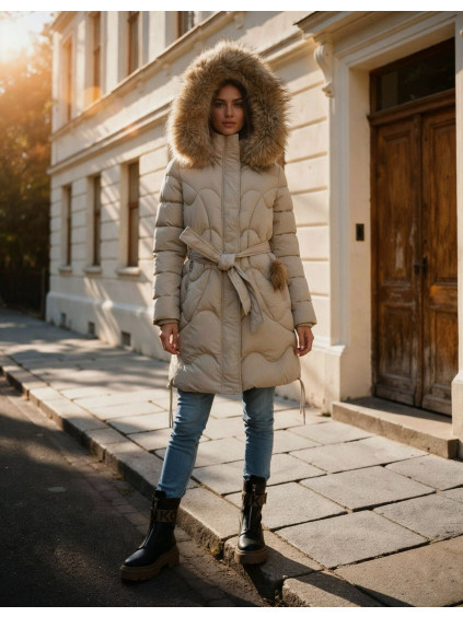 Elegantní dámská zimní parka/bunda s kapucí (odepínací na zip), kapuce lemovaná bohatou umělou odepínací kožešinou, vepředu kapsy, zapínání na zip plus cvočky, prodloužená délka, v pase na stažení páskem. .